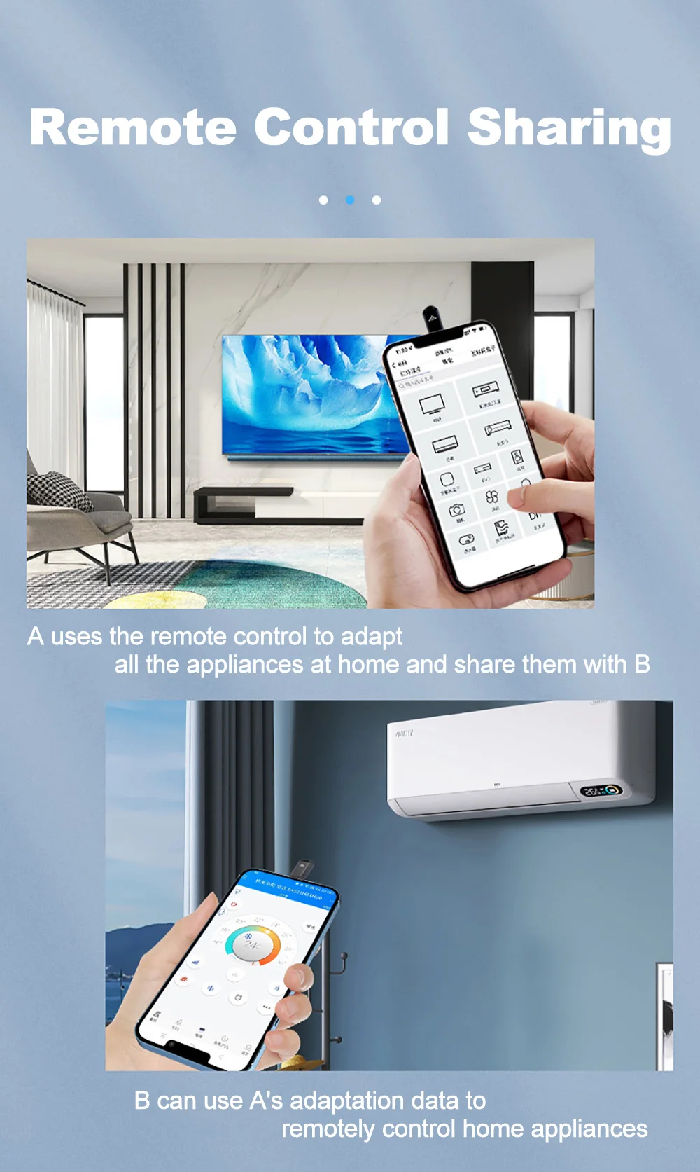 A uses the remote control to adapt all the appliances at home and share them with B,B can use A's adaptation data to remotely control home appliances